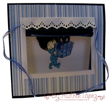 And guess what? Betty of Simply Betty Stamps is sponsoring us today!!! yes, her digi's, rubber and clear stamps are just beautiful, stop by her store!!! I choose to use Big Gift Lilly Digi and I decided to no color her, instead I decided to do “paper piercing”, I printed the digi on black cardstock for the hair, beige for the skin, blue for the bow, pattern paper for the pajama and the gift, cut all the pieces and glue them together.