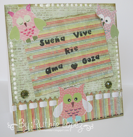 Yo use papeles de diferentes tipos. El papel decorado del centro lo rasge y lo entinte, ahí mismo coloque frases con mis sellos de Color Paws, el set Colores. En la base use una perforadora de Martha Stewart y me encanto porque tiene para colocar el listo, así que aquí mismo use dos técnicas. Imprimí y recorte los búhos, le puse Rhinestone verdes, puntos blancos con pintura blanca y listo!! mi tarjeta quedo lista!