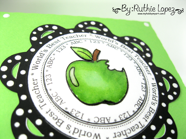 I colored him with Copics and added glossy accents to the apple. On each side I added part of the sentiment where the World´s Best Teacher part is. Added enamel accents dots here and there.